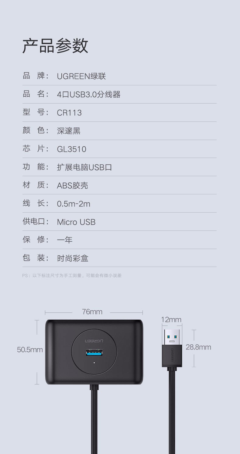 绿联USB3.0四口分线器0.5M 20290 黑色